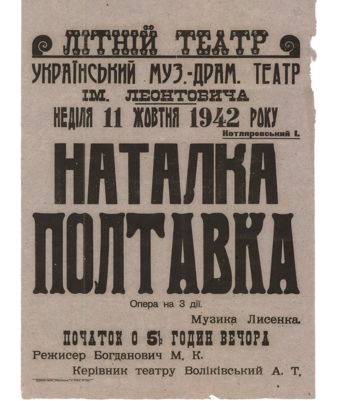Во время оккупации Ромен немецко-фашистскими захватчиками здесь продолжалась культурная жизнь. Ярким подтверждением тому афиши Роменского Украинского музыкально-драматического театра имени Леонтовича. Эти афиши датируются 1941-43 годами. Хочется обратить внимание, на то, что они написаны на украинском языке.