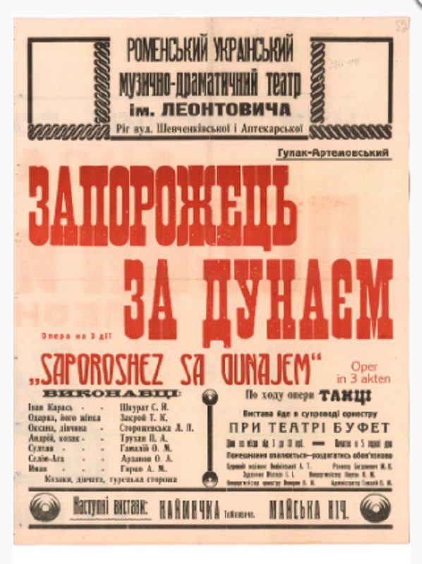 Не отставал от коллег и Роменский драматический железнодорожный театр. Здесь ставили «Дай сердцу волю заведет в неволю» Марка Кропивницкого и его же пьесу «Пошились в дураки», «Сорочинская ярмарка» Михаила Старицкого и т.д. Как видим, даже почти через 20 лет после оккупации Украины большевиками, после репрессий 30-х годов, украинский язык никуда не делся, говорили на украинском, думали на украинском и играли на сцене на украинском языке.